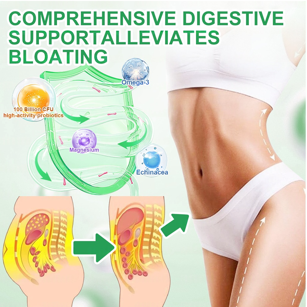 100 Billion CFU high-activity probiotics (including Lactobacillus rhamnosus GG, Bifidobacterium lactis BB-12, Lactobacillus plantarum, Bifidobacterium breve, and Lactobacillus casei, etc.) rapidly restore gut microbiota balance, suppress harmful bacteria, and increase beneficial bacteria. They relieve bloating and discomfort, promote regular motility and nutrient absorption, and strengthen immune defenses. Clinical data show that 92% of users experienced significant digestive improvement and reduced bloating within 2โ4 weeks. At the same time, Echinacea stimulates immune defenses, apple cider vinegar powder enhances gut motility, Omega-3 reduces inflammation and protects the immune system, while magnesium helps balance stress and indirectly supports gut function. These ingredients work synergistically to maximize the core benefits of probiotics for gut health and immunity.