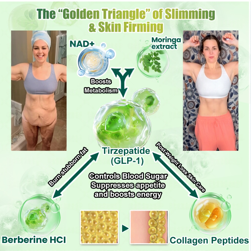 Appetite Control with Lasting Energy: Tirzepatide, Berberine HCl, and NAD+ act on the central nervous system to enhance satiety signals, block hunger cues, and reshape long-term eating habits. Meanwhile, Moringa Leaf Extractโrich in over 90 nutrientsโsupports weight management by helping suppress appetite, stabilize blood sugar, and boost metabolic efficiency. Its bioactive compounds also enhance fat oxidation while delivering steady, natural energy, reducing fatigue and keeping the body active and alert throughout the day. The result is reduced food intake, increased energy levels, and enhanced whole-body wellness.